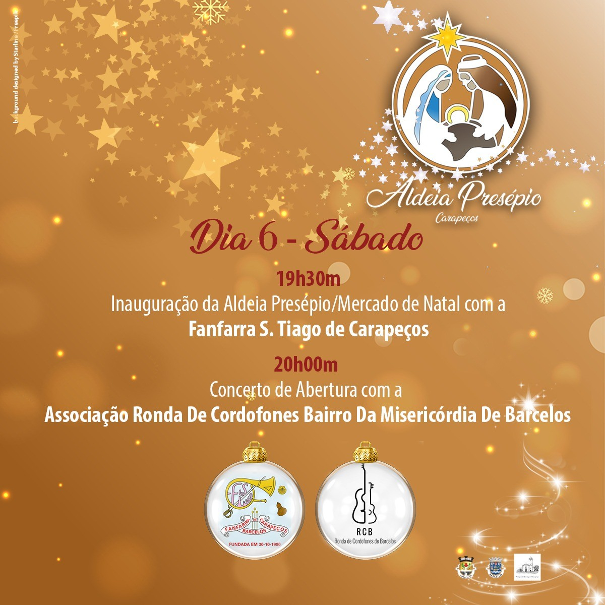 Sábado 6, às 19:30 horas, Inauguração Aldeia Presépio, Mercado de Natal com a fanfarra de Carapeços