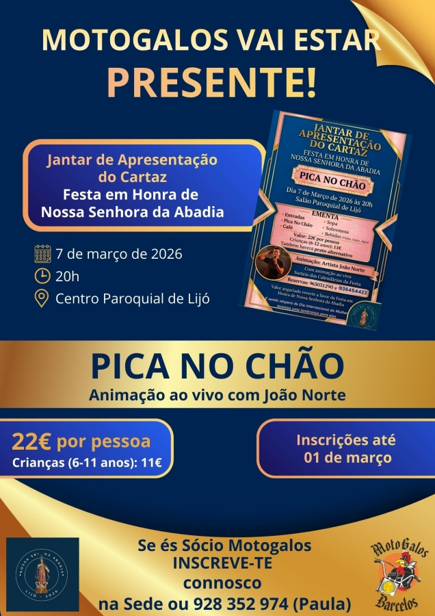No próximo dia 7 de março de 2026, às 20h, no Centro Paroquial de Lijó, será realizado o Jantar de Apresentação do Cartaz da Festa em Honra de Nossa Senhora da Abadia. Este momento representa uma excelente oportunidade para reforçarmos o espírito de união, convívio e participação ativa na comunidade. O jantar inclui o tradicional “Pica no Chão” e será animado ao vivo por João Norte, garantindo um excelente ambiente de convívio.
