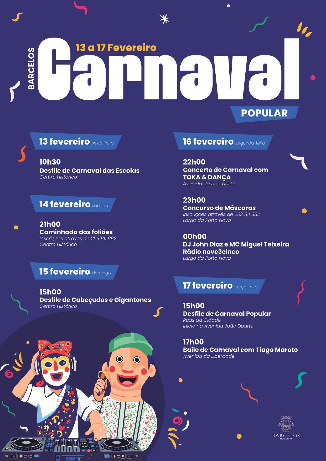De 13 a 17 de fevereiro, Barcelos volta a vestir-se de cor, música e boa disposição para celebrar o Carnaval Popular 2026, numa programação que junta tradição, criatividade e muita diversão.