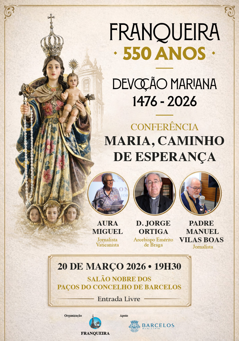 No âmbito das comemorações de “Franqueira – 550 Anos de Devoção Mariana (1476–2026)”, realiza-se no próximo dia 20 de março de 2026, entre as 19h30 e as 21h00, no Salão Nobre dos Paços do Concelho de Barcelos (antiga Igreja do Hospital do Espírito Santo), a 2.ª Conferência do Ciclo Comemorativo, subordinada ao tema: “Maria, Caminho de Esperança” Devoção Mariana entre o Magistério da Igreja, a Vivência do Povo e os Desafios do Presente A iniciativa pretende promover um momento de reflexão e diálogo sobre o significado da devoção mariana na vida da Igreja e das comunidades, cruzando a dimensão universal do magistério da Igreja com a experiência concreta vivida nas comunidades e confrarias.