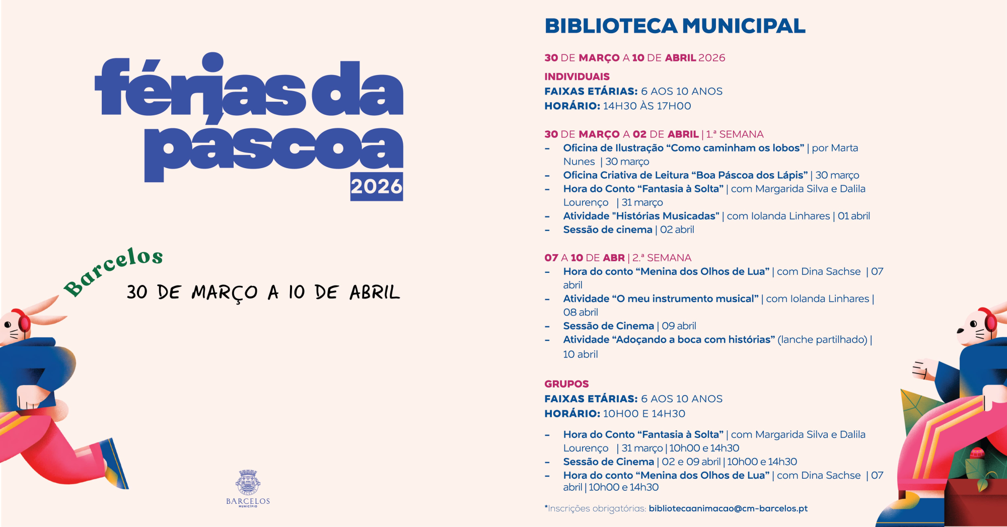 A Biblioteca Municipal também abre portas às férias da Páscoa. Uma divertida aventura no mundo dos livros vai motivar aprendizagens que valorizam a curiosidade e a criatividade, tendo como ponto de partida o contacto com o livro (hora do conto, oficinas de leitura, jogos e cinema). As inscrições são gratuitas, mas obrigatórias, devendo ser feitas pelo e mail: bibliotecaanimacao@cm-barcelos.pt.