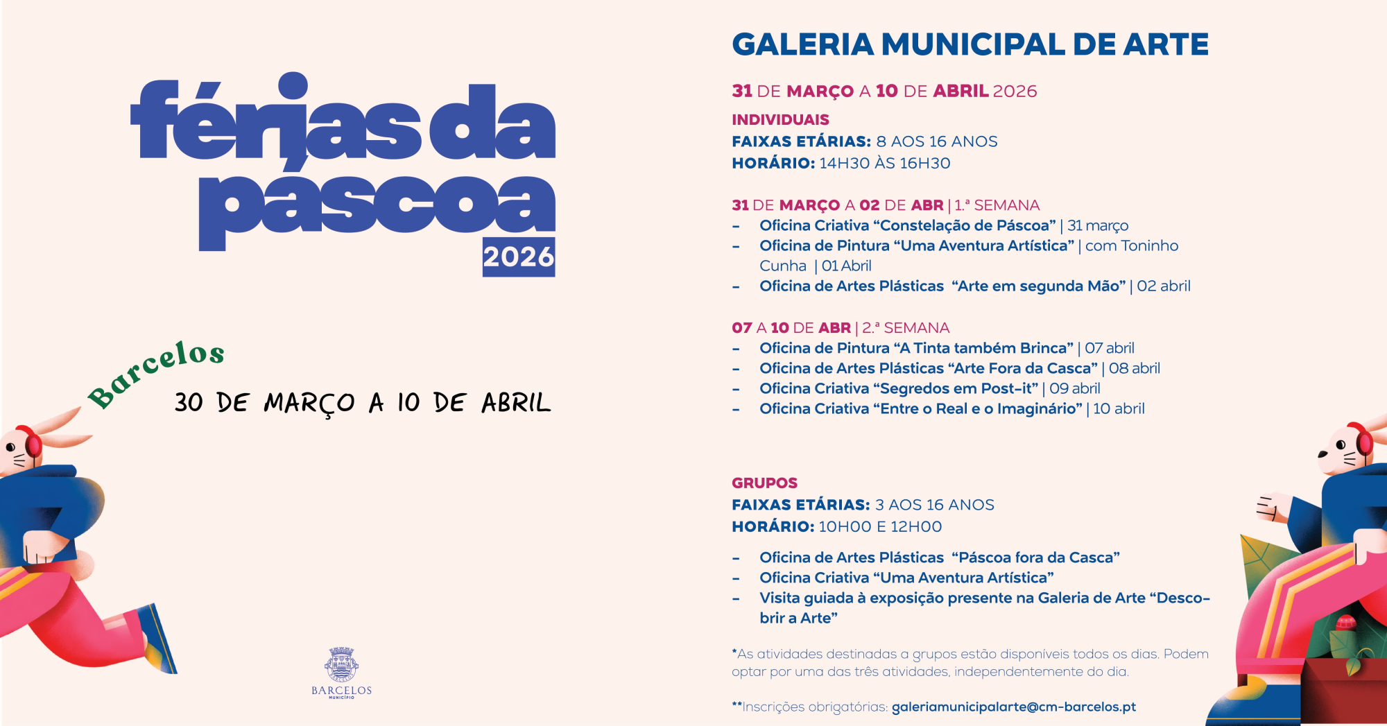 O Município de Barcelos vai promover múltiplas atividades lúdicas para a ocupação dos tempos livres dos mais novos, a desenvolver nos diversos equipamentos municipais, durante a interrupção letiva das férias da Páscoa (de 30 de março a 10 de abril). As atividades terão lugar na Biblioteca Municipal, na Galeria de Arte, no Museu de Olaria, no Pavilhão Municipal e no Theatro Gil Vicente.