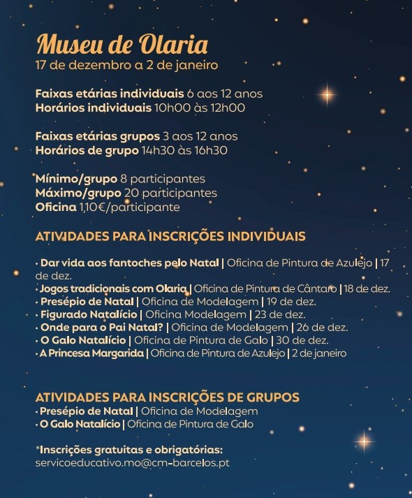 Cinema, teatro, ateliês de criação de enfeites de Natal, construção de marionetas, modelagens em barro, pintura de peças e azulejos e, ainda, criação de enfeites natalícios são algumas das atividades que irão decorrer entre os próximos dias 17 de dezembro e 2 de janeiro.