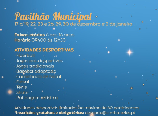O Município de Barcelos tem abertas as inscrições para o já tradicional programa de “Férias Escolares de Natal”, dirigido a crianças e jovens dos seis aos 16 anos de idade, bem como a instituições e associações do concelho que promovam atividades de grupo com esta população.