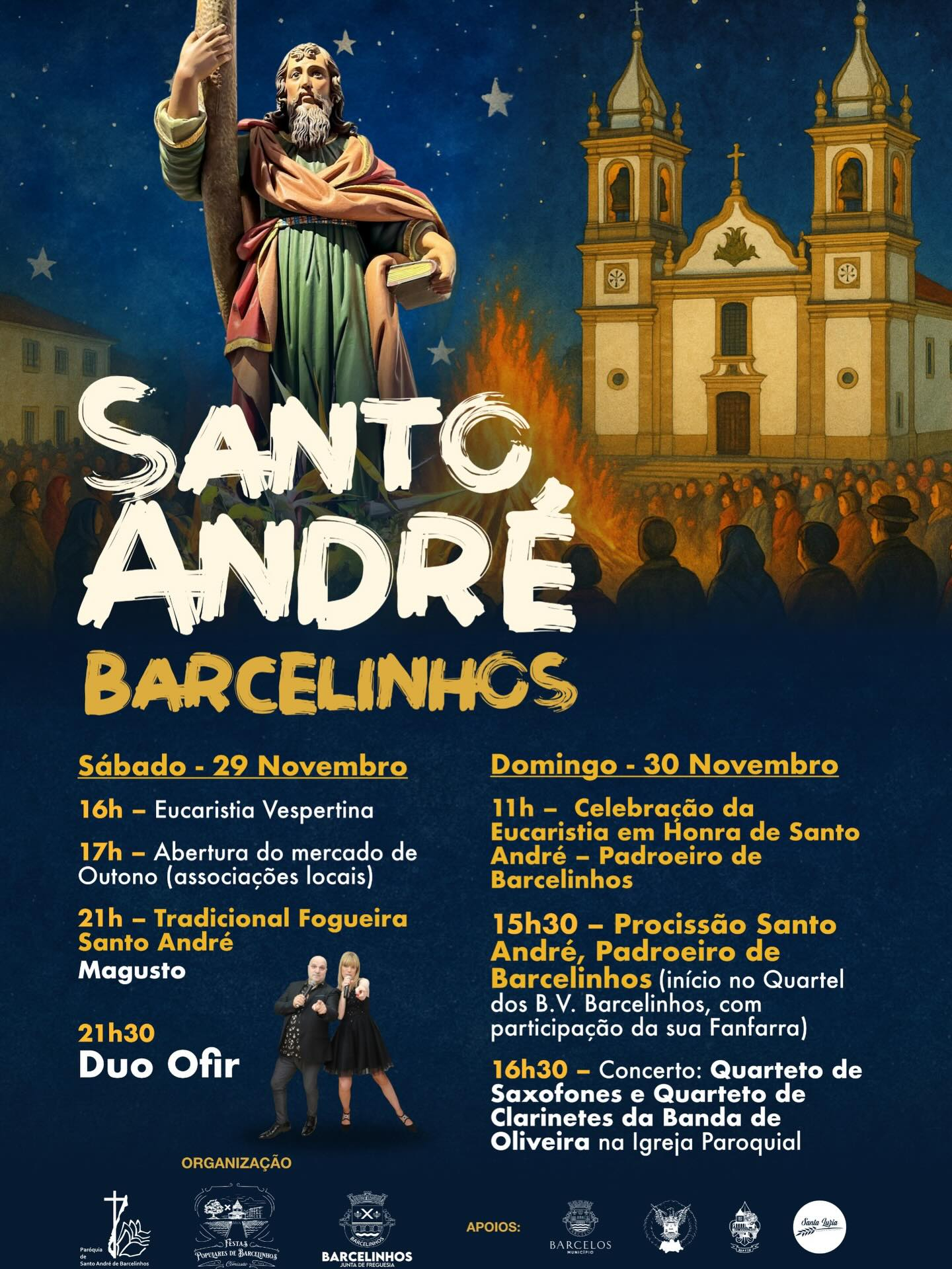 Barcelinhos faz festa a Santo André, este sábado e domingo. No sábado, a eucaristia vespertina realiza-se às 16h00, depois abre o mercado de outono com as associações locais e, às 21h00, começa o magusto com a Tradicional Fogueira de Santo André. A noite segue com atuação de Duo Ofir. Domingo, a celebração da eucaristia em honra de Santo André será às 11h00 e à tarde sai a procissão no quartel dos Bombeiros de Barcelinhos com a participação da Fanfarra. Às 16h30, começa o concerto do Quarteto de Saxofones e Quarteto de Clarinetes da Banda de Oliveira, na Igreja Paroquial.