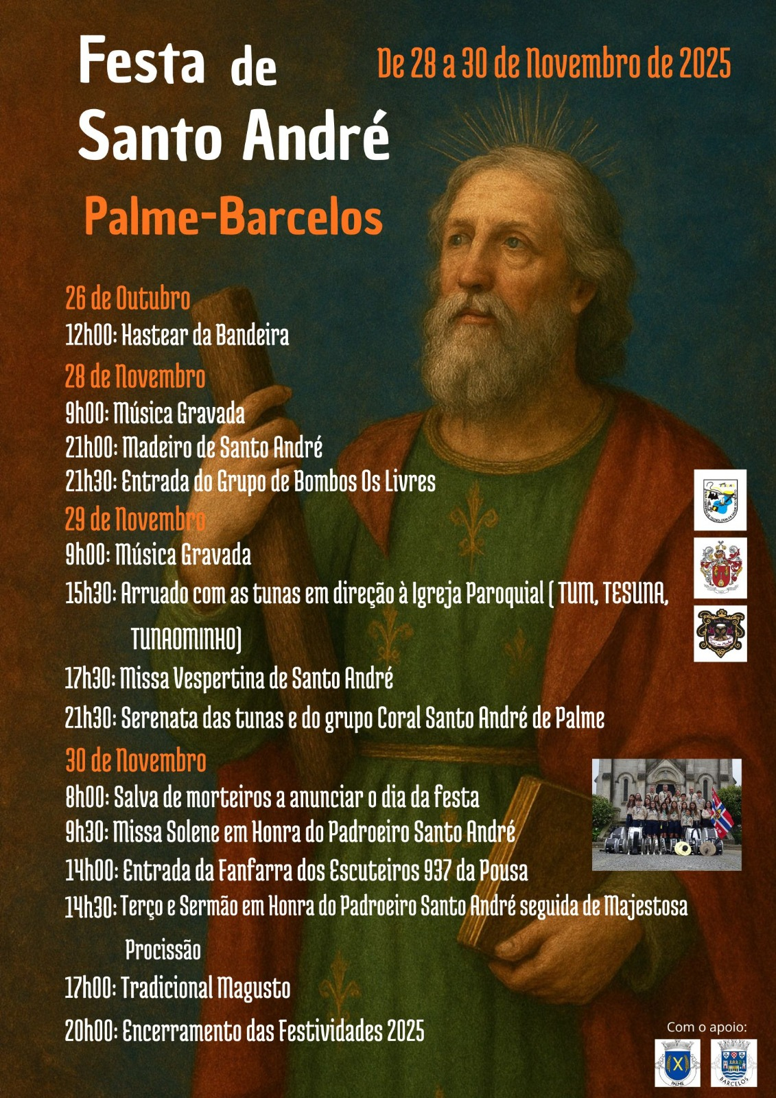 Palme cumpre tradição com a festa a Santo André no fim de semana. Destaque na sexta-feira para o Madeiro de Santo André às 21h00 e depois entrada do Grupo de Bombos Os Livres. Sábado, às 15h30, começa a arruada com as tunas académicas para a Igreja Paroquial. Participam a TUM, Tesuna, Tunaominho que sobem a palco às 21h30 para a serenata em parceria com o Grupo Coral de Santo André de Palme.