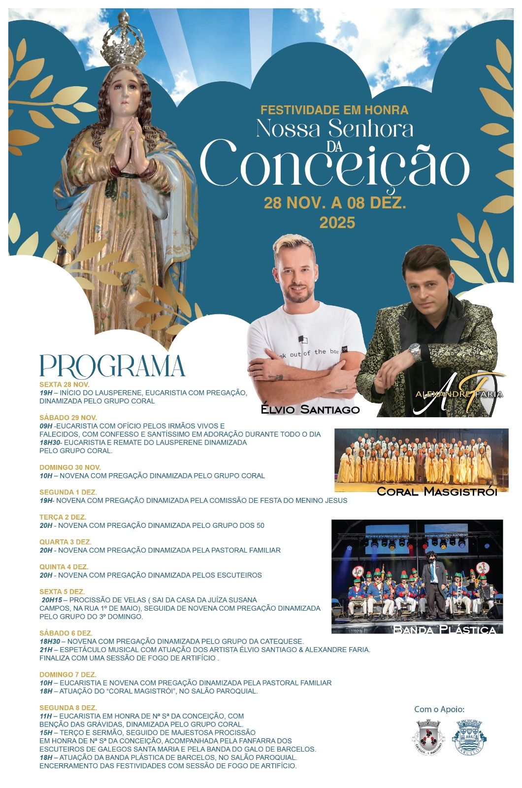Galegos São Martinho faz festa à Senhora da Conceição, Galegos São Martinho volta a cumprir a tradição de fazer festa a Nossa Senhora da Conceição, no próximo fim de semana. Destaque na sexta-feira para a procissão de velas às 20h15. Sábado, às 21h00, começa o espetáculo musical com atuação de Élvio Santiago e Alexandre Faria. No domingo, às 18h00, começa atuação do Coral Magistrói, no Salão Paroquial e, segunda-feira, atenções para a missa às 11h00 com bênção das grávidas. Às 15h00, inicia o terço e sermão, seguido de procissão acompanhada pela Fanfarra dos Escuteiros de Galegos Santa Maria e Banda do Galo. No final, atua a Banda Plástica, no Salão Paroquial.