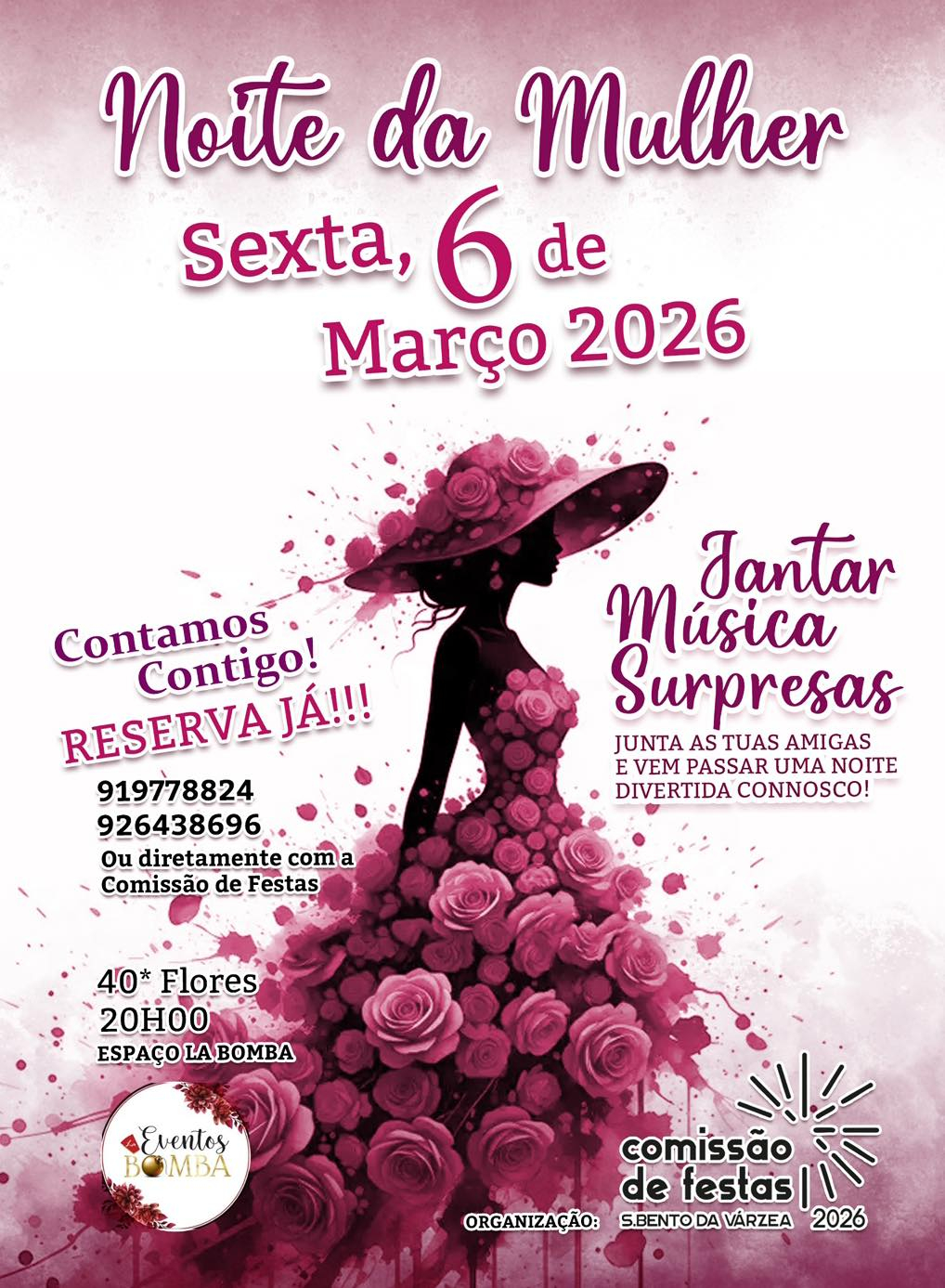 Noite da Mulher – Juntas por uma boa causa ✨ Porque todas as mulheres merecem ser celebradas, vamos juntar-nos numa noite especial de convívio, alegria e solidariedade! 💜 Convidamos todas as mulheres para uma noite pensada especialmente para vocês — com boa disposição, partilha, música e surpresas. Juntas as amigas, as mães, as tias,… todas todas todas!!! 🩷 E vamos tornar esta noite inesquecível 🤩✨ A vossa presença faz a diferença! 🤍 📅 Data: 6 de Março 🕘 Hora: 20H00 📍 Local: Espaço ‘LaBomba’ RESERVA JÁ! Contamos contigo 💪🏻