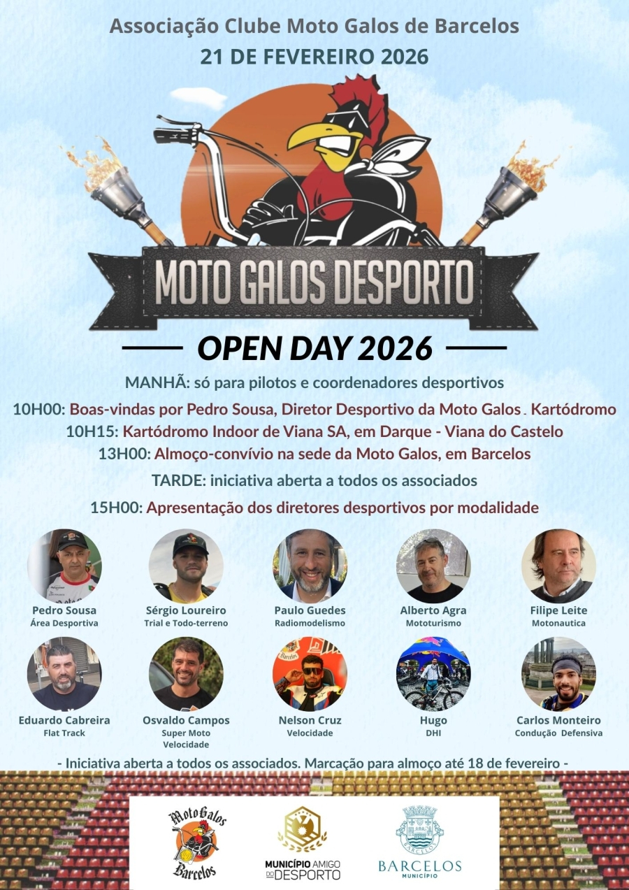 A edição 2026 do "Open Day Moto Galos" realiza-se a 21 de fevereiro, entre o Kartódromo Indoor de Viana do Castelo em Darque e a Sede em Barcelos, com o objetivo de consolidar a dinâmica desportiva do clube.