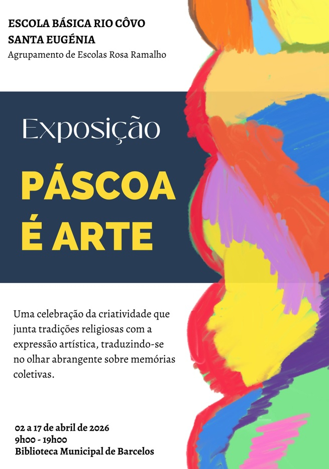 A Escola Básica Rio Côvo Santa Eugénia apresenta a exposição "Páscoa é Arte", na Biblioteca Municipal de Barcelos, patente ao público de 02 a 17 de abril de 2026, com trabalhos realizados por alunos e famílias subordinados ao tema "PÁSCOA É ARTE".