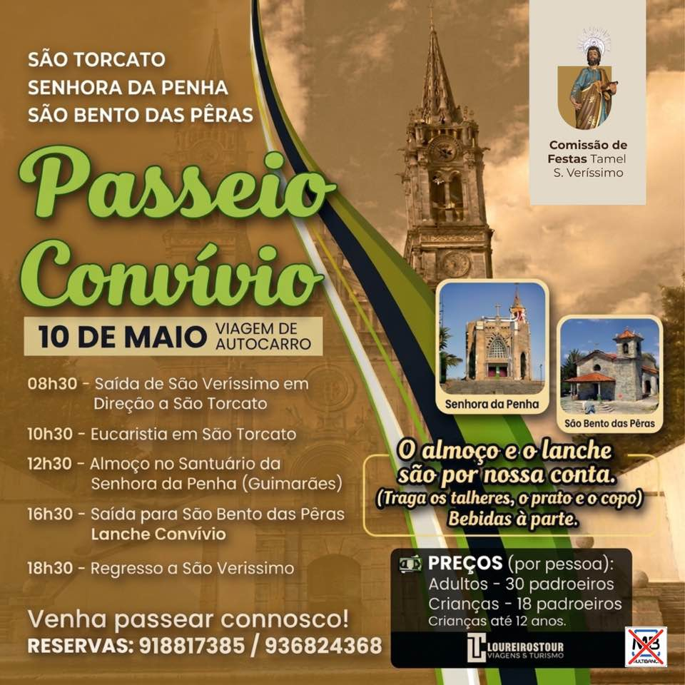 🌿 Um dia para conviver, partilhar e criar memórias… A Comissão de Festas de Tamel São Veríssimo convida-te a juntares-te a nós no nosso passeio no dia 10 de maio 🙌 Vamos visitar São Torcato, Senhora da Penha e São Bento das Pêras, num dia cheio de fé, amizade e boa disposição. 🥖 Almoço convívio na Senhora da Penha (traz talheres, prato e copo) 🍷 Lanche convívio durante a tarde A comida fica por nossa conta 💶 Adultos: 30€ 👶 Crianças (até 12 anos): 18€ 📞 Reservas: 918 817 385 / 936 824 368 👉 Junta a família e amigos e vem fazer parte deste dia especial!