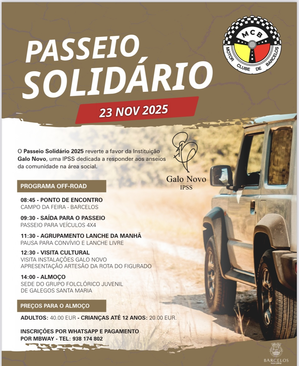 O Passeio Solidário 2025 reverte a favor da Instituição Galo Novo, uma IPSS dedicada a responder aos anseios da comunidade na área social.
