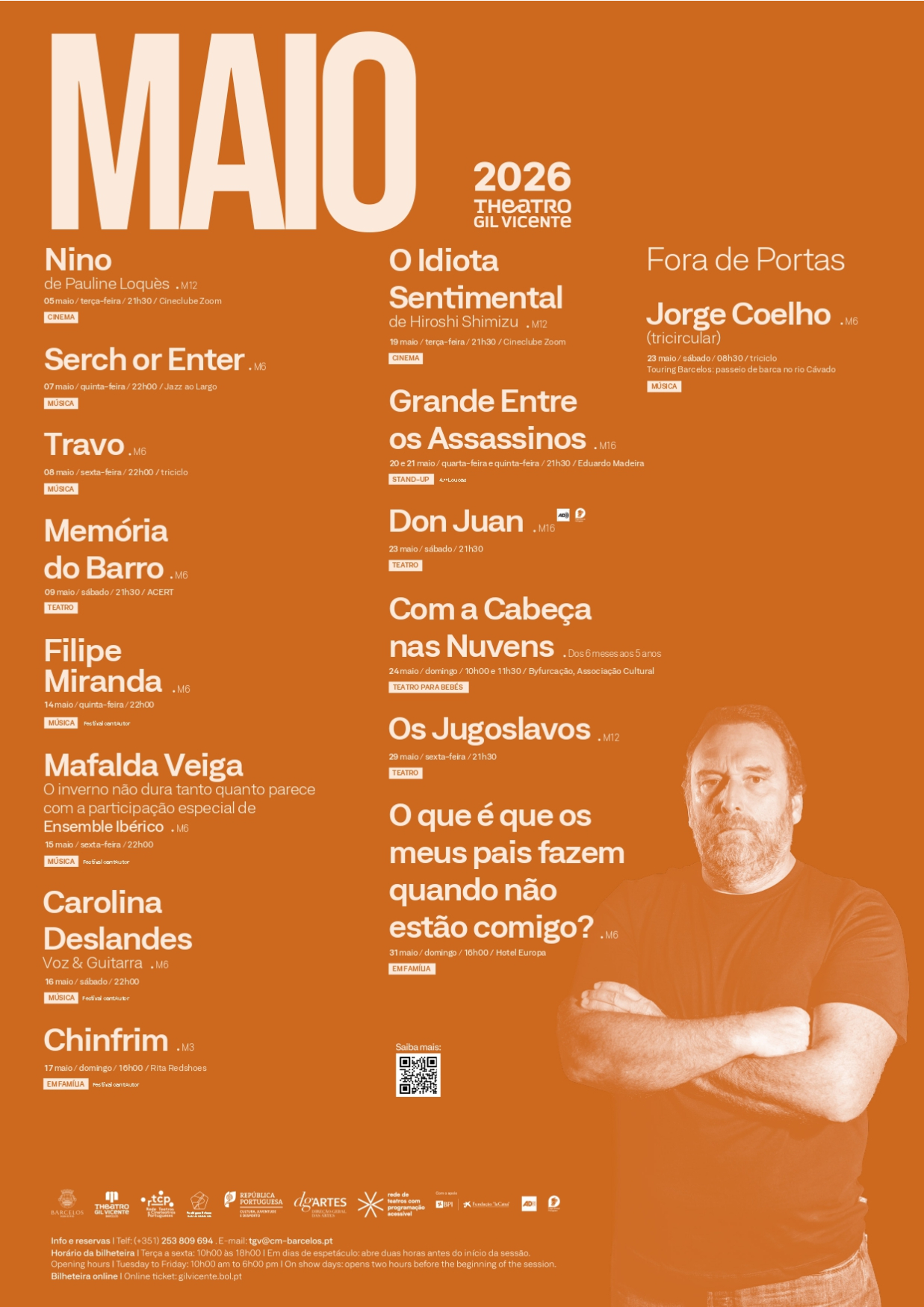 O Theatro Gil Vicente (TGV), em Barcelos, apresenta, em maio e junho de 2026, uma programação marcada pela diversidade de linguagens artísticas e pela relação próxima com diferentes públicos, cruzando propostas de música, teatro, cinema, dança, humor e atividades dirigidas a famílias, bem como iniciativas que se estendem ao espaço público e ao território.