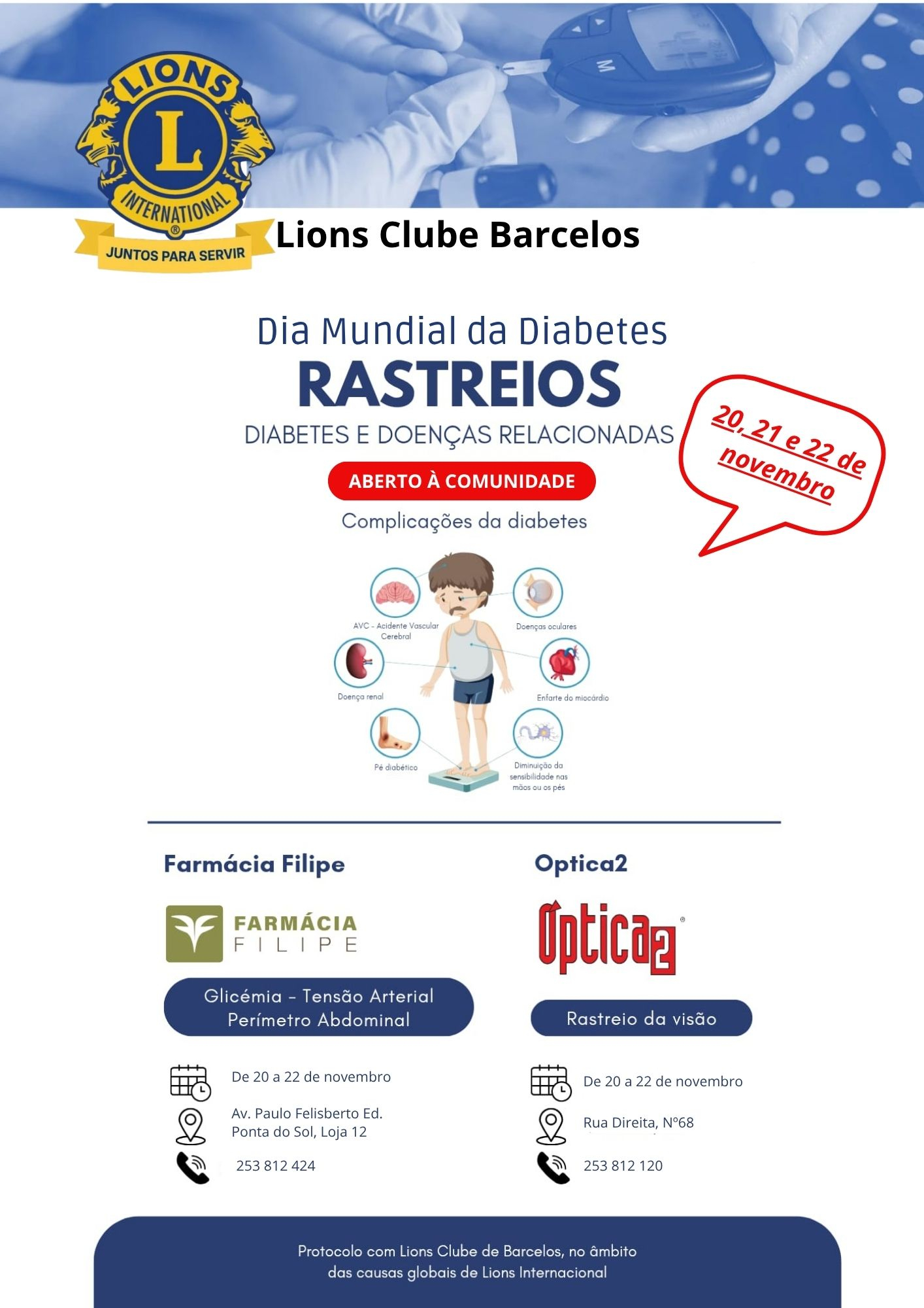 O Lions Clube de Barcelos promove. nos próximos dias 20, 21 e 22 de novembro, uma ação de 'Rastreios da Diabetes e Doenças Associadas', nos estabelecimentos associados identificados no prospecto em anexo, com o objetivo de sensibilizar e prevenir patologias que afetam milhares de cidadãos, muitas vezes de forma silenciosa.