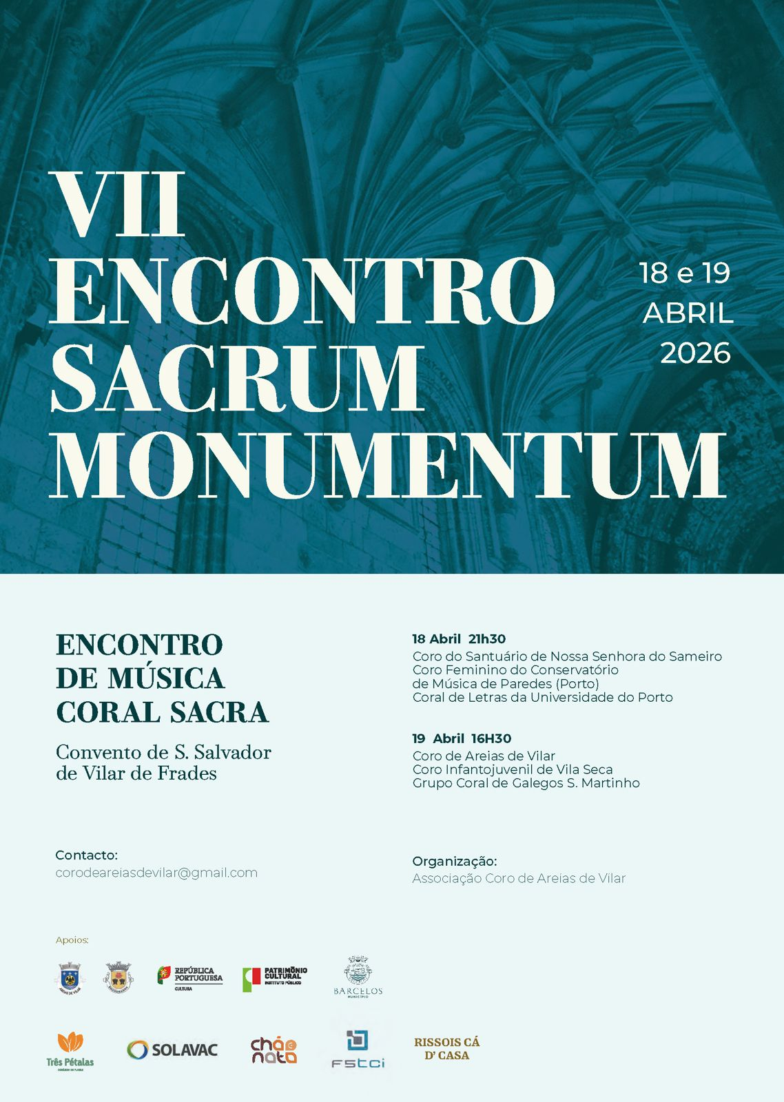 No fim de semana do Dia Nacional dos Monumentos e Sítios pretendemos honrar o Convento - Monumento Nacional desde 1910, dignificando-o neste evento de Música Coral Sacra. No dia 18/04 é dado destaque a Coros de fora do nosso concelho (Coro do Santuário do Sameiro, Coral de Letras da Univ do Porto e Coro Feminino do Conservatório de Música de Paredes), a fim de trazer projetos novos e diferentes ao público. Na tarde do dia 19/04 é dedicada a grupos do nosso concelho (Coro de Areias de Vilar - Anfitrião do Eventos, Coro InfantoJuvennil de Vila Seca e Grupo Coral de Galegos S. Martinho) a fim de partilharmos o trabalho dos nosso conterrâneos e promover a partilha de experiências e o intercâmbio de experiências. A Entrada é livre e contamos com todos.