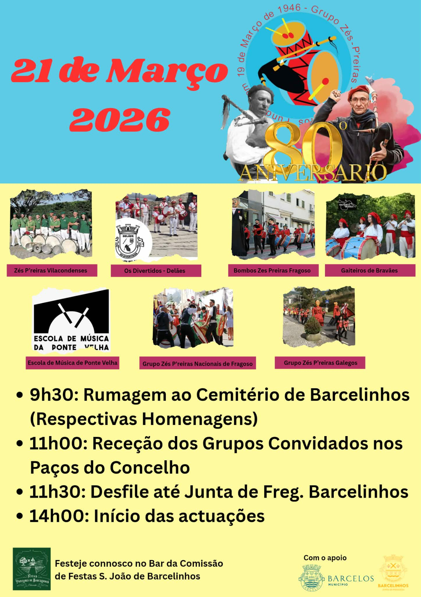 A partir das 14h00 começam as atuações: Zés P’reiras Vilacondenses; Os Divertidos Delães; Bombos Zés Preiras de Fragoso; Gaiteiros de Bravães; Escola de Música de Ponte Velha, Grupo Zés P´reiras Nacionais de Fragoso e Grupo Zés P’reiras Galegos.